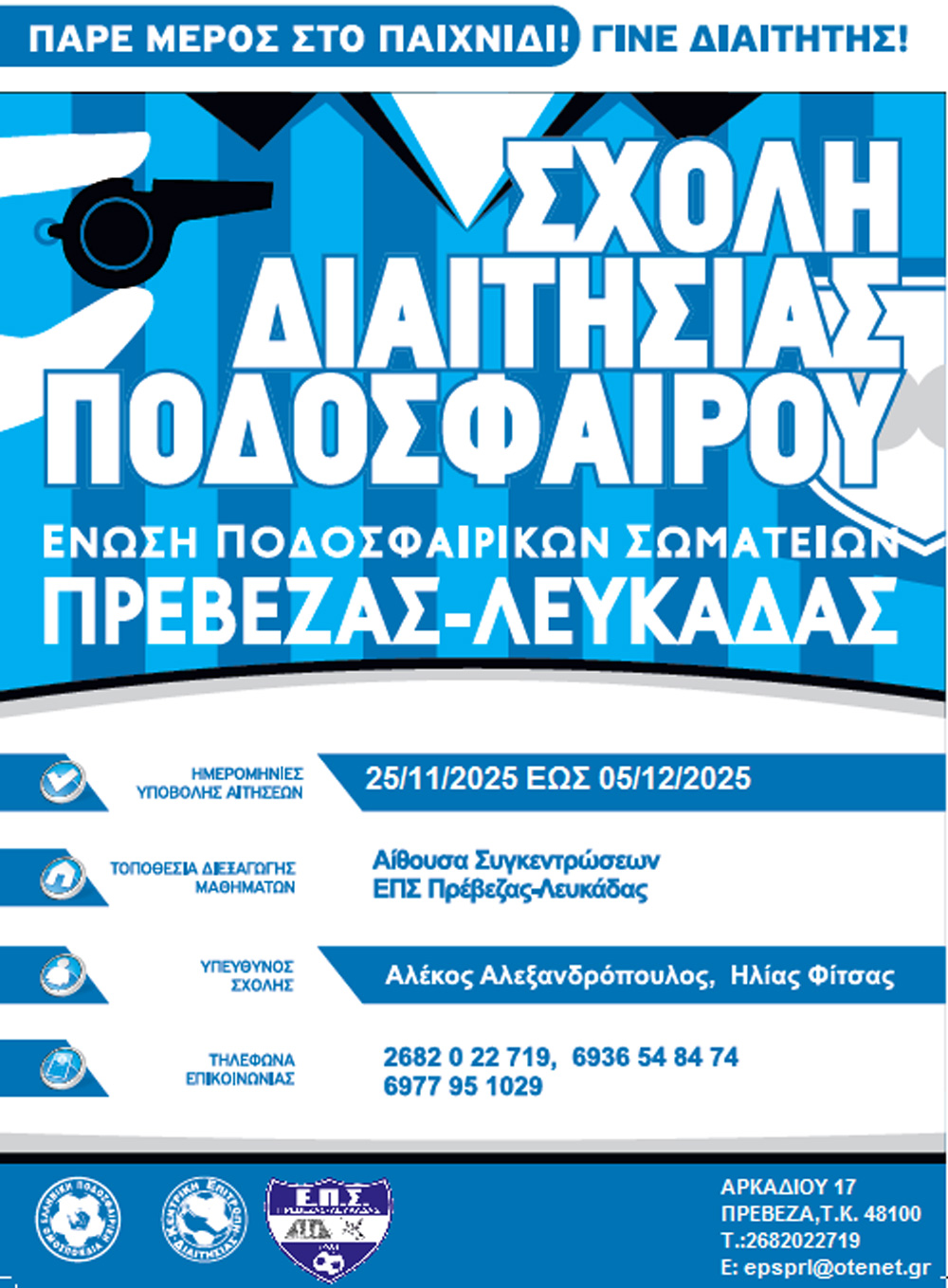 Η Ένωση Ποδοσφαιρικών Σωματείων Πρέβεζας– Λευκάδας ανακοινώνει τη δημιουργία Νέας Σχολής Διαιτησίας Ποδοσφαίρου , καλώντας νέους και νέες που αγαπούν το ποδόσφαιρο να κάνουν το επόμενο βήμα και να μπουν δυναμικά στον κόσμο της διαιτησίας!