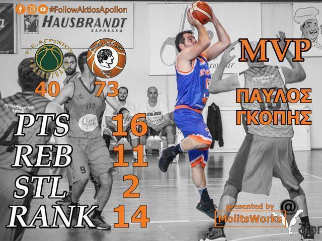 Η ομάδα μας παρουσιάστηκε με αρκετές απουσίες στη σύνθεση της καθώς την αποστολή στο Αγρίνιο δεν ακολούθησαν οι Τσέτσικας, Ευθυμίου, Κιτσαντάς, Κίτσιος, Βουκελάτος και Ρίππης. Ωστόσο οι παίκτες μας ήταν σοβαροί από την αρχή του παιχνιδιού απέναντι στους «μικρούς» της ΓΕ Αγρινίου παίρνοντας σημαντική διαφορά στο σκορ, με το ημίχρονο να ολοκληρώνεται με σκορ 16-39. Το 2ο ημίχρονο απέκτησε διαδικαστικό χαρακτήρα με την ομάδα μας απλά να διατηρεί μια διαφορά στο σκορ και τον coach Παπαμιχαήλ να μοιράζει το χρόνο συμμετοχής σε όλους τους παίκτες.