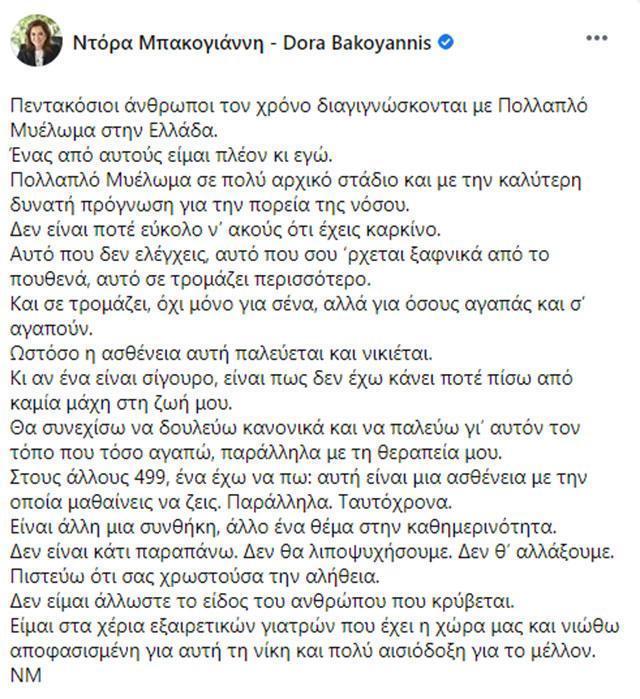 Μούδιασμα έχει προκαλέσει η ανακοίνωση της Ντόρας Μπακογιάννη, ότι διαγνώστηκε με πολλαπλό μυέλωμα. «Δεν είναι ποτέ εύκολο ν' ακούς ότι έχεις καρκίνο» έγραψε σε ανάρτησή της η βουλευτής της ΝΔ και πρώην υπουργός, δημοσιοποιώντας το πρόβλημα της υγείας της.