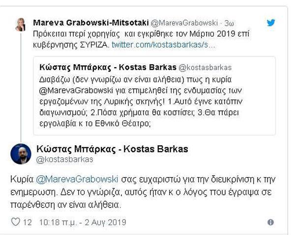 Ο Κ. Μπάρκας έγραψε τα εξής: «Διαβάζω (δεν γνωρίζω αν είναι αλήθεια) πως η κυρία @MarevaGrabowski για επιμεληθεί της ενδυμασίας των εργαζομένων της Λυρικής σκηνής! 1.Αυτό έγινε κατόπιν διαγωνισμού; 2.Πόσα χρήματα θα κοστίσει; 3.Θα πάρει εργολαβία κ το Εθνικό Θέατρο;».