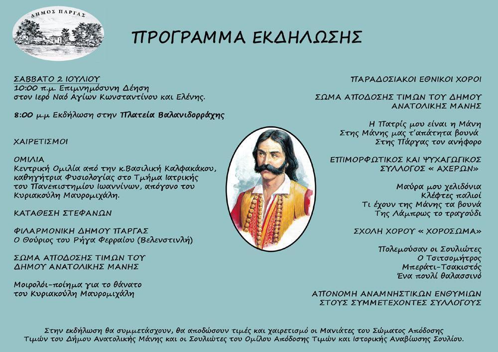 Ο Δήμος Πάργας διοργανώνει επετειακή εκδήλωση για τη Μάχη της Σπλάντζας, τόπου αγώνα και θυσίας των προγόνων μας, καθώς και του Μανιάτη Οπλαρχηγού Κυριακούλη Μαυρομιχάλη.