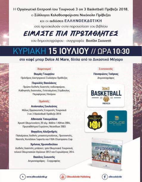 Στα πλαίσια της εβδομάδας αθλητισμού που λαμβάνει χώρα στην Πρέβεζα το διάστημα 9-15 Ιουλίου, η Οργανωτική Επιτροπή του "Τουρνουά Μπάσκετ 3on3 Πρέβεζας", ο Σύλλογος Καλαθοσφαίρισης Νικόπολη Πρέβεζας και οι εκδόσεις Ελληνοεκδοτική σας προσκαλούν στην παρουσίαση του βιβλίου "Είμαστε πια Πρωταθλητές" του δημοσιογράφου- συγγραφέα Βασίλη Σκουντή την Κυριακή 15 Ιουλίου και ώρα 10:30 το πρωί στο καφέ-μπαρ Dolce al Mare, δίπλα από το δικαστικό μέγαρο.