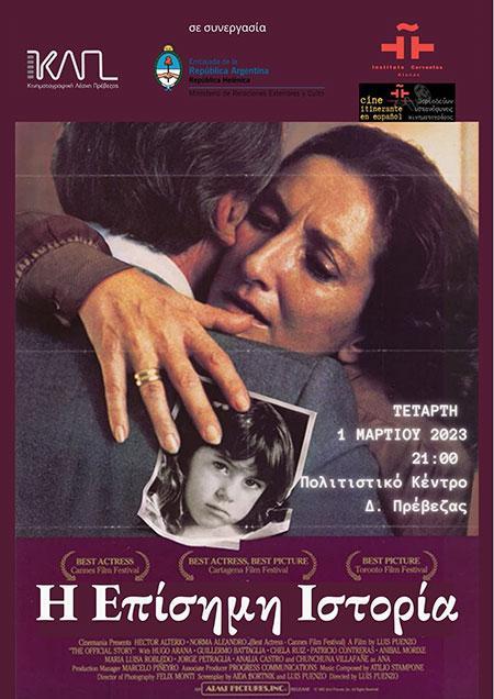 Η Κινηματογραφική Λέσχη πιστή στην προβολή ταινιών με κινηματογραφικό χαρακτήρα και αισθητική ξεκινά ένα αφιέρωμα στον ισπανόφωνο κινηματογράφο με την αμέριστη και πολύτιμη συμβολή του Ινστιτούτου Θερβάντεςκαι της Πρεσβείας της Αργεντινής στην Ελλάδα την Τετάρτη1 Μαρτίου2023, 21:00προβάλλοντας την ταινία«Επίσημη Ιστορία/ Historiaofficial»,στο Πολιτιστικό Κέντρο του Δήμου Πρέβεζας με ελεύθερη είσοδο.Το πρόγραμμα έχει σκοπό να γνωρίσει στο ελληνικό κινηματογραφόφιλο κοινό τον κινηματογράφο των ισπανόφωνων χωρών. Για τον λόγο αυτόν, το Ινστιτούτο Θερβάντες συνεργάζεται με την Ταινιοθήκη του ισπανικού Υπουργείου Εξωτερικών, τις πρεσβείες διαφόρων χωρών, όπως η Ισπανία, η Αργεντινή, η Ουρουγουάη και το Προξενείο του Ισημερινού.