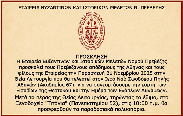 Η Εταιρεία Βυζαντινών και Ιστορικών Μελετών Νομού Πρεβέζης, συνεχίζοντας το έθιμο με τα «Πολυσπόρια», που τηρείται ακόμη στην Πρέβεζα και στα χωριά της, απευθύνει πρόσκληση προς τους Πρεβεζάνους απόδημους της Αθήνας και τους φίλους της Εταιρείας να συνεορτάσουν όλοι μαζί την εορτή των Εισοδίων της Θεοτόκου και την Ημέρα των Ενόπλων Δυνάμεων.