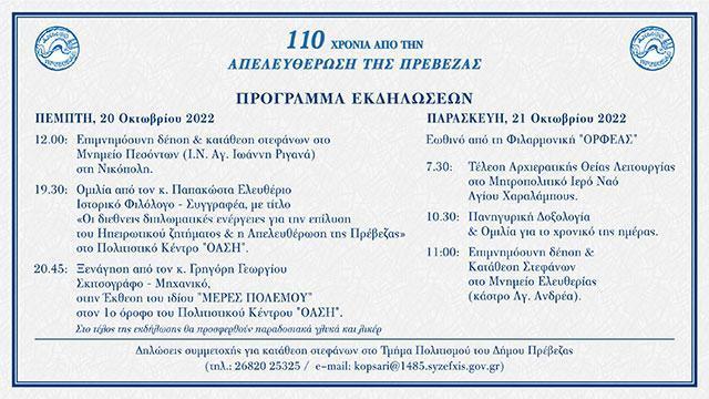 Εκδηλώσεις για τα 110 χρόνια από την απελευθέρωση της Πρέβεζας διοργανώνει ο Δήμος Πρέβεζας στις 20 και 21 Οκτωβρίου.