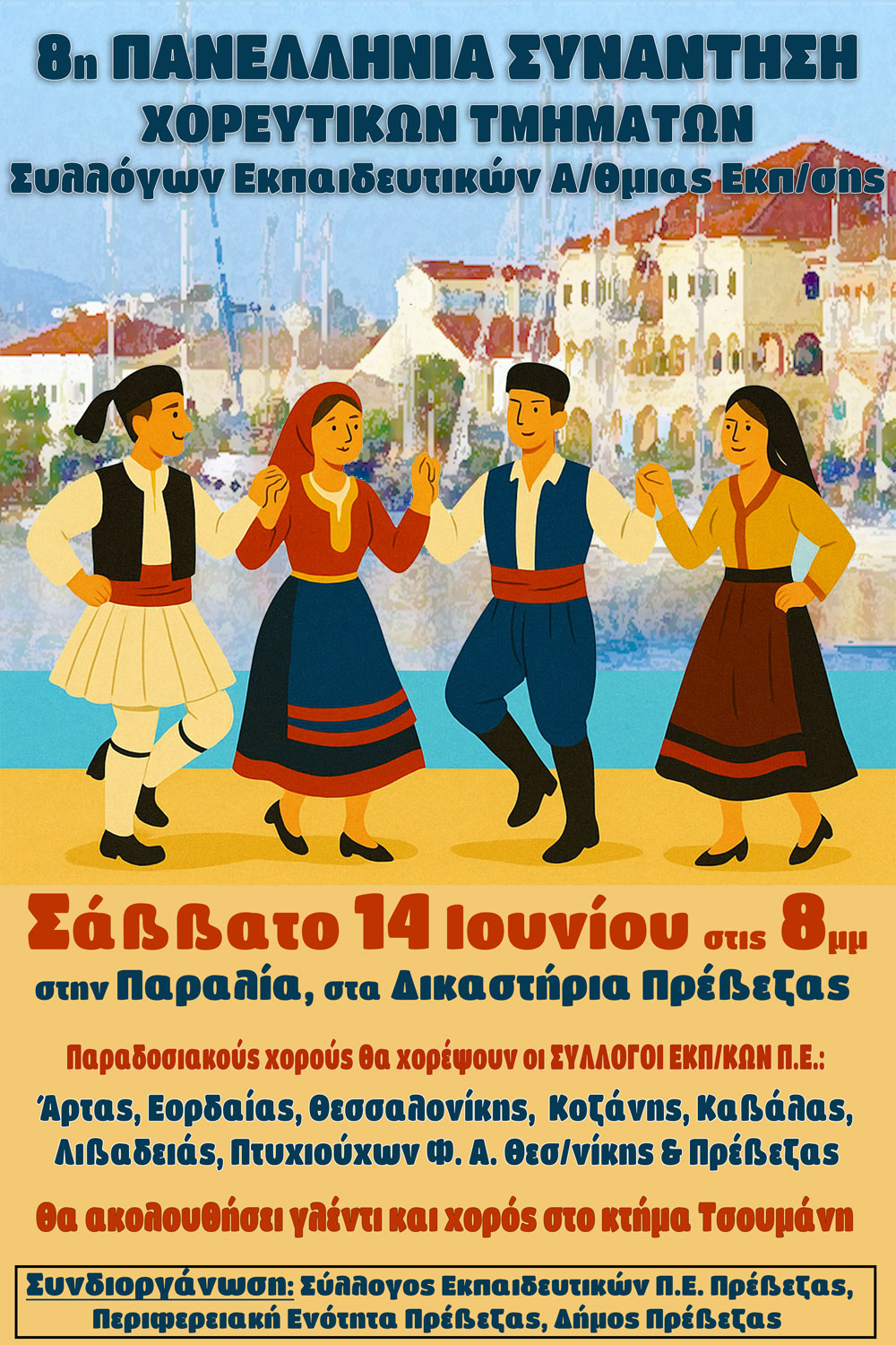 Ο Σύλλογος Εκπαιδευτικών ΠΕ Πρέβεζας διοργανώνει στις 14 Ιουνίου 2025 την 8η πανελλήνια συνάντηση χορευτικών τμημάτων συλλόγων πρωτοβάθμιας εκπαίδευσης.