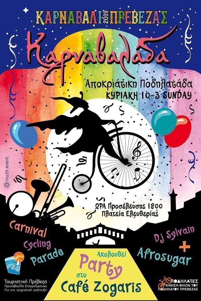 Η Τουριστική Πρέβεζα σε συνεργασία με τους Φίλους του Ποδηλάτου Πρέβεζας διοργανώνουν ξανά την Καρναβαλάδα ή Αποκριάτικη ποδηλατάδα! Μασκαρεμένοι ποδηλάτες θα κάνουν μια βόλτα στο ιστορικό κέντρο την Κυριακή 10 Μαρτίου στις 6 το απόγευμα ξεκινώντας από την πλατεία Ελευθερίας συμμετέχοντας στην καύση του Καρνάβαλου και επιστροφή στο καφέ Ζόγγαρης όπου θα γίνει το πάρτι της εκδήλωσης με τον Dj Sylvain και με τους Afrosugar live !