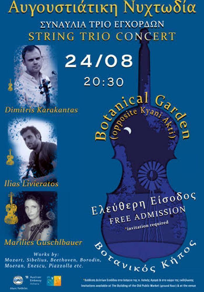 Ένα μελωδικό ταξίδι στις μουσικές της Ευρώπης θα χαρίσουν στο κοινό της Πρέβεζας τρεις διακεκριμένοι μουσικοί που θα συναντηθούν την Τρίτη 24 του μήνα και ώρα 20:30 σε μια «Αυγουστιάτικη Νυχτωδία» στον ειδυλλιακό χώρο του Βοτανικού Κήπου.
