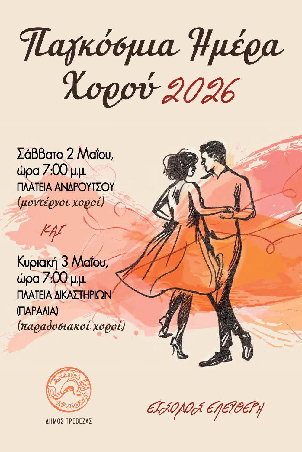 Ο Δήμος Πρέβεζας και το Τμήμα Πολιτισμού σας προσκαλούν στις εκδηλώσεις που θα πραγματοποιηθούν το Σάββατο 2 Μαΐου 2026 και ώρα 7μ.μ ,στην Πλ. Ανδρούτσου και την Κυριακή 3 Μαΐου 2026 και ώρα 7μ.μ, στην Πλ. Δικαστηρίων στην Πρέβεζα.