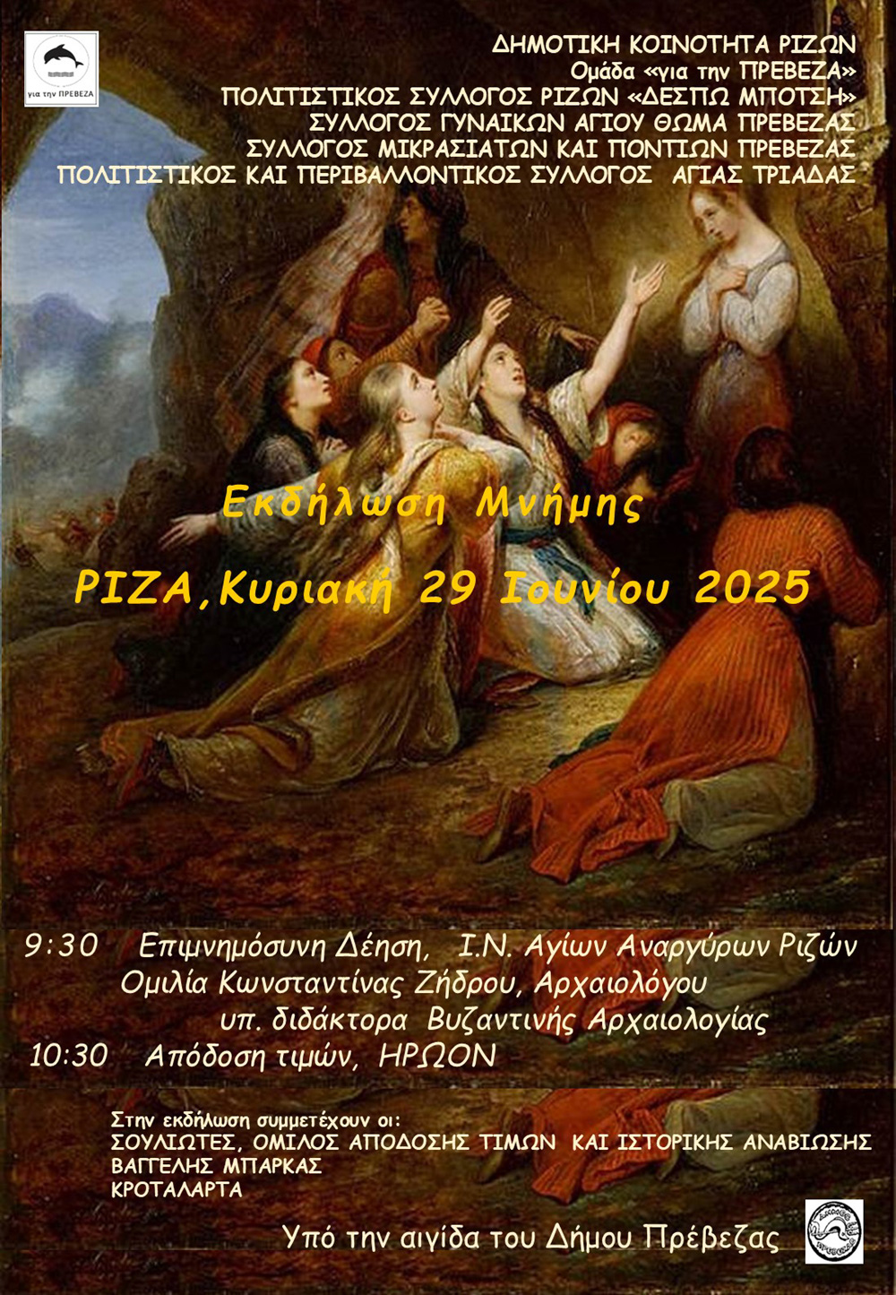 Την Κυριακή 29 Ιουνίου θα πραγματοποιηθεί στα Ριζά Πρέβεζας, εκδήλωση μνήμης και τιμής για το ολοκαύτωμα της Δέσπως Μπότση και της οικογένειάς της. Η εκδήλωση τελεί υπό την αιγίδα του Δήμου Πρέβεζας και διοργανώνεται από την Τοπική Κοινότητα Ριζών, την ομάδα «για την ΠΡΕΒΕΖΑ», τον Πολιτιστικό Σύλλογο Ριζών Δέσπω Μπότση», τον Σύλλογο Γυναικών Αγίου Θωμά, τον Σύλλογο Μικρασιατών και Ποντίων Πρέβεζας και τον Πολιτιστικό-Περιβαλλοντικό Σύλλογο Αγίας Τριάδας.