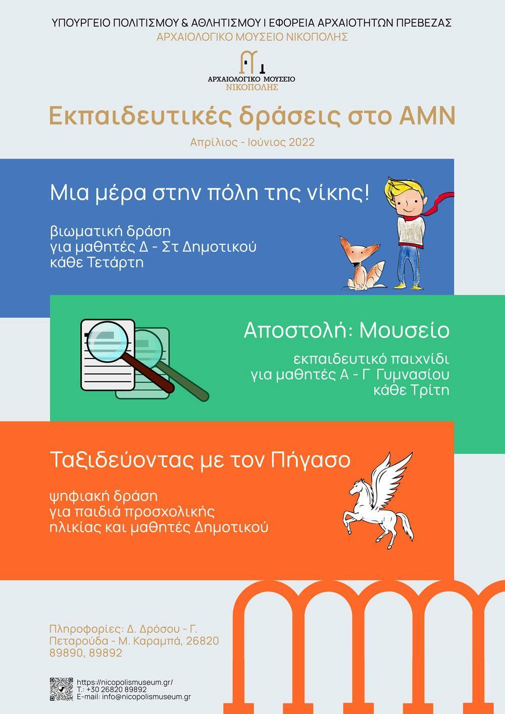Πληροφορίες: Δήμητρα Δρόσου, Μαρία Καραμπά, τηλ. 26820 89892 Η φόρμα συμμετοχής διατίθεται εδώ: https://nicopolismuseum.gr/amn educate 2022/