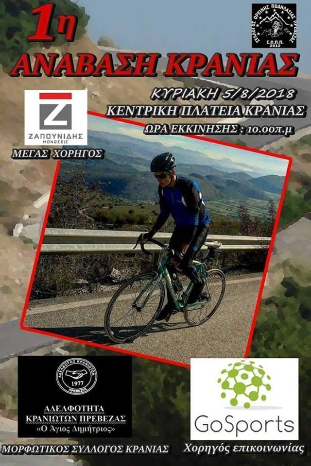 O Σύλλογος Ορεινής Ποδηλασίας Πρέβεζας (Σ.Ο.Π.Π.) συνδιοργανώνει με την Αδελφότητα Κρανιωτών Πρέβεζας και τον Μορφωτικό Σύλλογο Κρανιάς την Κυριακή 5 Αυγούστου 2018 στις 10 π.μ., την 1η Ποδηλατική Ανάβαση Κρανιάς, σε ασφάλτινη διαδρομή 11 χιλιομέτρων, με 700 μέτρα θετική υψομετρική διαφορά.