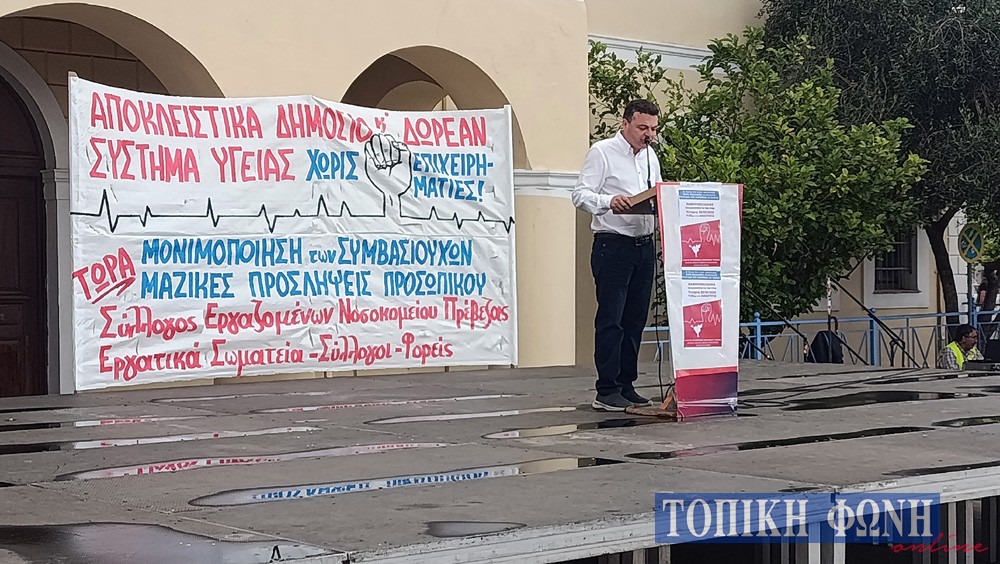 Στην κεντρική ομιλία, ο Πρόεδρος του Συλλόγου Εργαζομένων του Νοσοκομείου Πρέβεζας Κώστας Κύρλας μίλησε για τις ελλείψεις γιατρών στα Νοσοκομεία και τα Κέντρα Υγείας τονίζοντας μεταξύ άλλων «Δεν έχουμε δικαίωμα να κάνουμε βήμα πίσω από το αυτονόητο, να υπάρχει στην Πρέβεζα Νοσοκομείο στο οποίο να μπορεί να βρίσκει κάποιος σε σταθερή βάση Παθολόγο, Χειρουργό, Παιδίατρο».