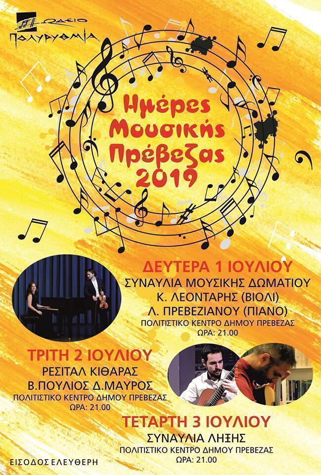 Οι παραπάνω εκδηλώσεις πραγματοποιούνται στα πλαίσια των Ημερών Μουσικής Πρέβεζας 2019 που περιλαμβάνουν Σεμινάρια από τους καταξιωμένους καλλιτέχνες Κώστα Γρηγορέα στην κιθάρα και Δημήτρη Φωτόπουλο στο Φλάουτο και στη Μουσική Δωματίου.
