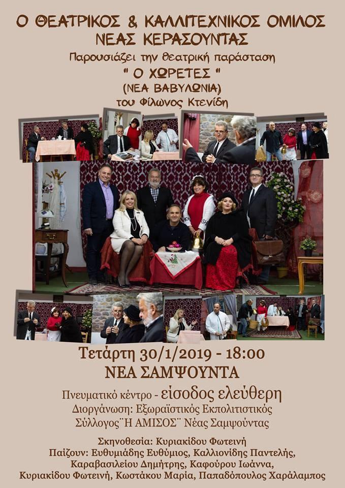 Το Διοικητικό Συμβούλιο του Εξωραϊστικού Εκπολιτιστικού Συλλόγου Ν.Σαμψούντας « Η ΑΜΙΣΟΣ» διοργανώνει την Θεατρική παράσταση «Ο ΧΩΡΕΤΕΣ» του Φίλωνος Κτενίδη, την Τετάρτη 30 Ιανουαρίου στις 6 το απόγευμα στο Πνευματικό Κέντρο από τον Θεατρικό & Καλλιτεχνικό Όμιλο Ν.Κερασούντας.