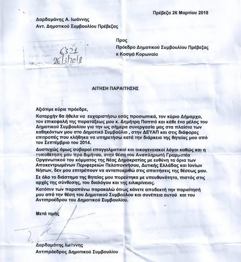 Την παραίτησή του από Δημοτικός Σύμβουλος υπέβαλε ο Γιάννης Δαρδαμάνης μετά την τοποθέτησή του ως Γενικού Γραμματέα στο Οργανωτικό της Νέας Δημοκρατίας.