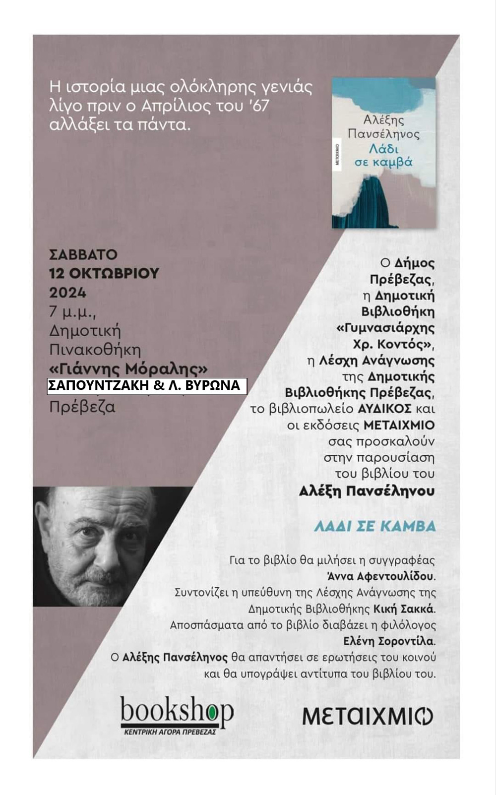 Ο Δήμος Πρέβεζας, η Δημοτική Βιβλιοθήκη, η Λέσχη Ανάγνωσης της Δημοτικής Βιβλιοθήκης Πρέβεζας και οι εκδόσεις Μεταίχμιο, συνδιοργανώνουν εκδήλωση για την παρουσίαση του βιβλίου του Αλέξη Πανσέληνου «Λάδι σε καμβά».