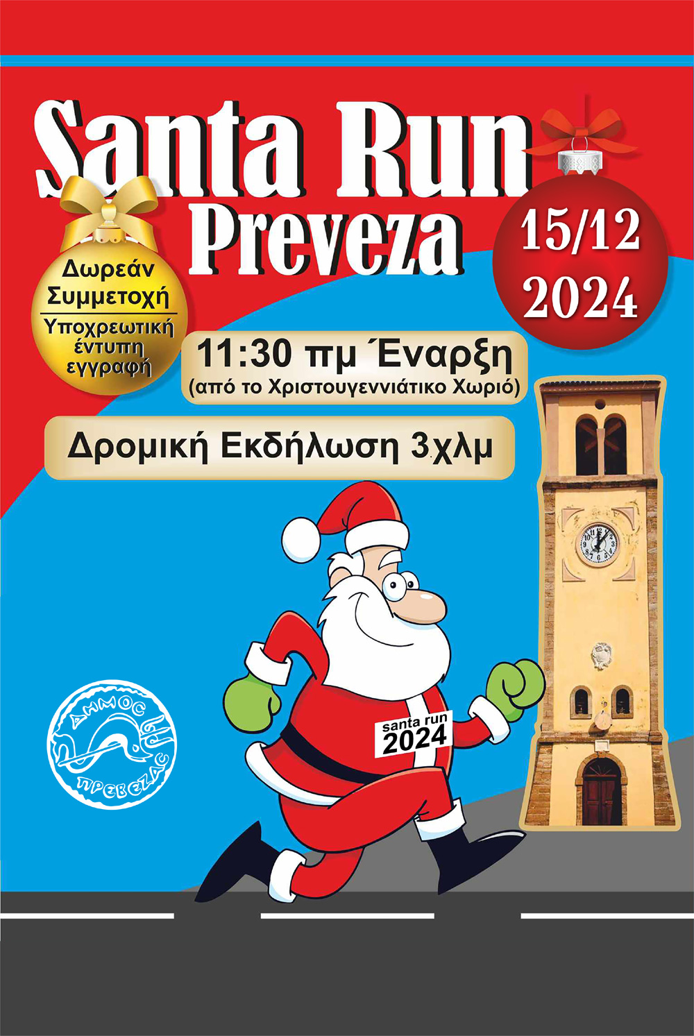 Ο Δήμος Πρέβεζας, σε συνεργασία με τον Α.Ο. Πρέβεζας «ΚΟΤΙΝΟΣ», τον Σύλλογο ΕΥΖΗΝ, το Σωματείο εργαζομένων ΕΚΑΒ 7ης Περιφέρειας και τον Σύλλογο Δρομέων Πρέβεζας, προκηρύσσει την διοργάνωση της Χριστουγεννιάτικης Δρομικής Εκδήλωσης ΄΄SANTA RUN PREVEZA 2024’’ απόστασης 3ων χιλιομέτρων. Οι εν λόγω διοργάνωση θα λάβει χώρα εντός του ιστού της πόλης της Πρέβεζας και έχει τον χαρακτήρα της γενικότερης παρακίνησης στον αθλητισμό, διασκέδασης μέσα από αθλητικά δρώμενα αλλά και προσφοράς μέσα από μια πολύ σημαντική δράση που αφορά στην συγκέντρωση χρημάτων (μέσο δωρεάς) για την προμήθεια απινιδωτή, που θα τοποθετηθεί σε κομβικό σημείο της πόλης. Για το λόγο αυτό θα υπάρχει στο Χριστουγεννιάτικο Χωριό κουμπαράς κατά την διάρκεια της εκδήλωσης, για όποιον επιθυμεί να δωρίσει έστω και ένα ελάχιστο ποσό. Η διαδρομή έχει αφετηρία και τερματισμό το Χριστουγεννιάτικο Χωριό που βρίσκεται στην πλατεία Ανδρούτσου.