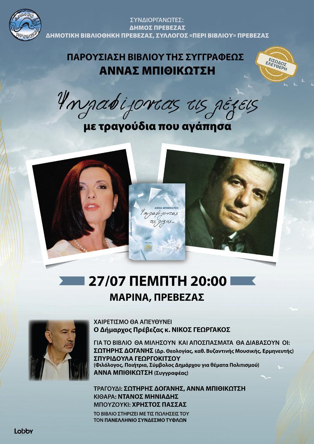 Ο Δήμος Πρέβεζας, η συγγραφέας Άννα Μπιθικώτση και η ΒΕΓΑΣ ΕΚΔΟΤΙΚΗ ΠΟΛΙΤΙΣΤΙΚΗ σας προσκαλούν στην επίσημη παρουσίαση του βιβλίου με τίτλο: «Ψηλαφίζοντας τις λέξεις…» της συγγραφέως ΑΝΝΑΣ ΜΠΙΘΙΚΩΤΣΗ την Πέμπτη 27 Ιουλίου και ώρα 20:00, στην Μαρίνα, Πρέβεζας