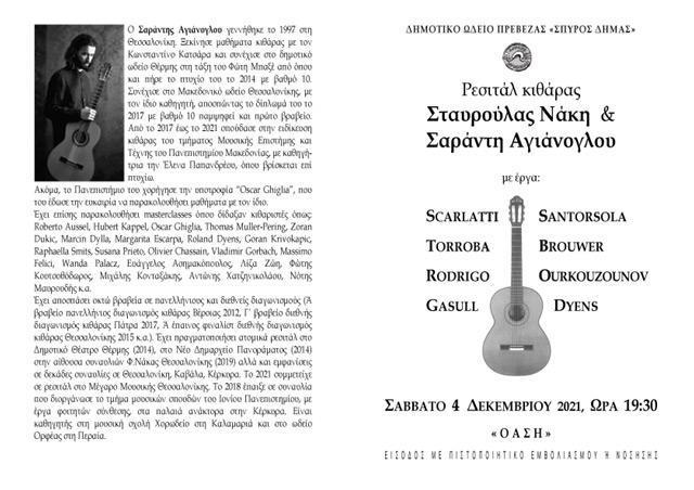 Το Δημοτικό Ωδείο Πρέβεζας «Σπύρος Δήμας», στα πλαίσια των καλλιτεχνικών και εκπαιδευτικών του δράσεων, διοργανώνει ρεσιτάλ κλασικής κιθάρας, το Σάββατο 4 Δεκεμβρίου 2021, ώρα 7:30 μ.μ. στην Όαση.