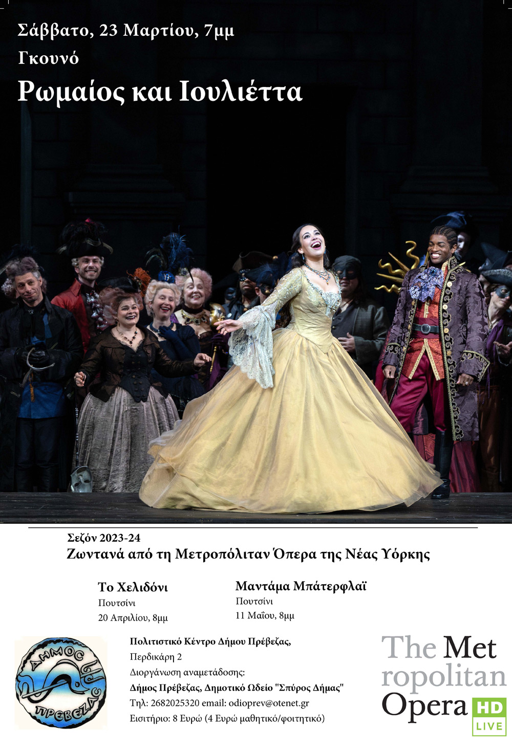 Οι απευθείας μεταδόσεις από τη Μετροπόλιταν Όπερα της Νέας Υόρκης, που διοργανώνει και παρουσιάζει στην Πρέβεζα το Δημοτικό Ωδείο Πρέβεζας «Σπύρος Δήμας» και ο Δήμος Πρέβεζας, συνεχίζονται το Σάββατο 23 Μαρτίου στις 7μμ (μια ώρα νωρίτερα από τη συνηθισμένη ώρα έναρξης) με την όπερα «Ρωμαίος και Ιουλιέττα» του Σαρλ Γκουνό.