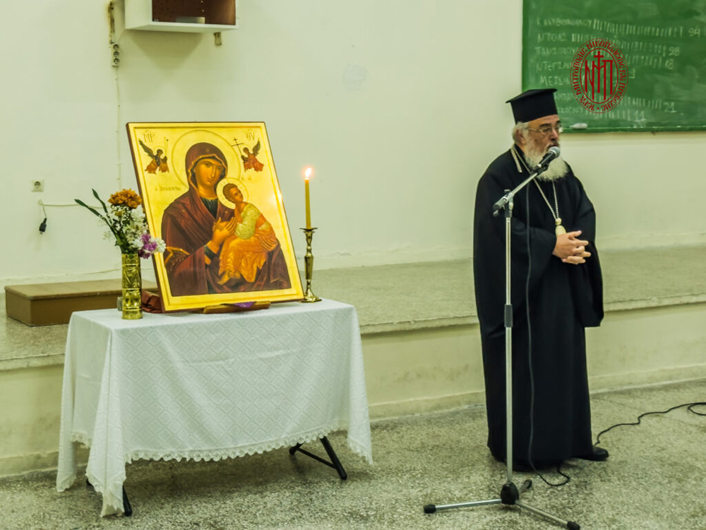 Στο τέλος της ακολουθίας ο Σεβασμιώτατος απηύθυνε πατρικό λόγο προς τούς καθηγητές καί τούς φοιτητές της Ακαδημίας, αναλύοντας θεολογικά το νόημα των Χαιρετισμών της Θεοτόκου. Αναφέρθηκε στη δύναμη της προσευχής προς την Παναγία, η οποία στέκεται ακοίμητη μεσίτρια προς τον Υιό της, χαρίζοντας στον καθένα από εμάς αυτό πού χρειαζόμαστε για την πνευματική μας ωφέλεια καί σωτηρία. Κατακλείοντας ευχήθηκε πατρικά καλή συνέχεια στον πνευματικό αγώνα της Σαρακοστής καί ευλογημένη Ανάσταση, γεμάτη φως, ελπίδα καί χαρά.