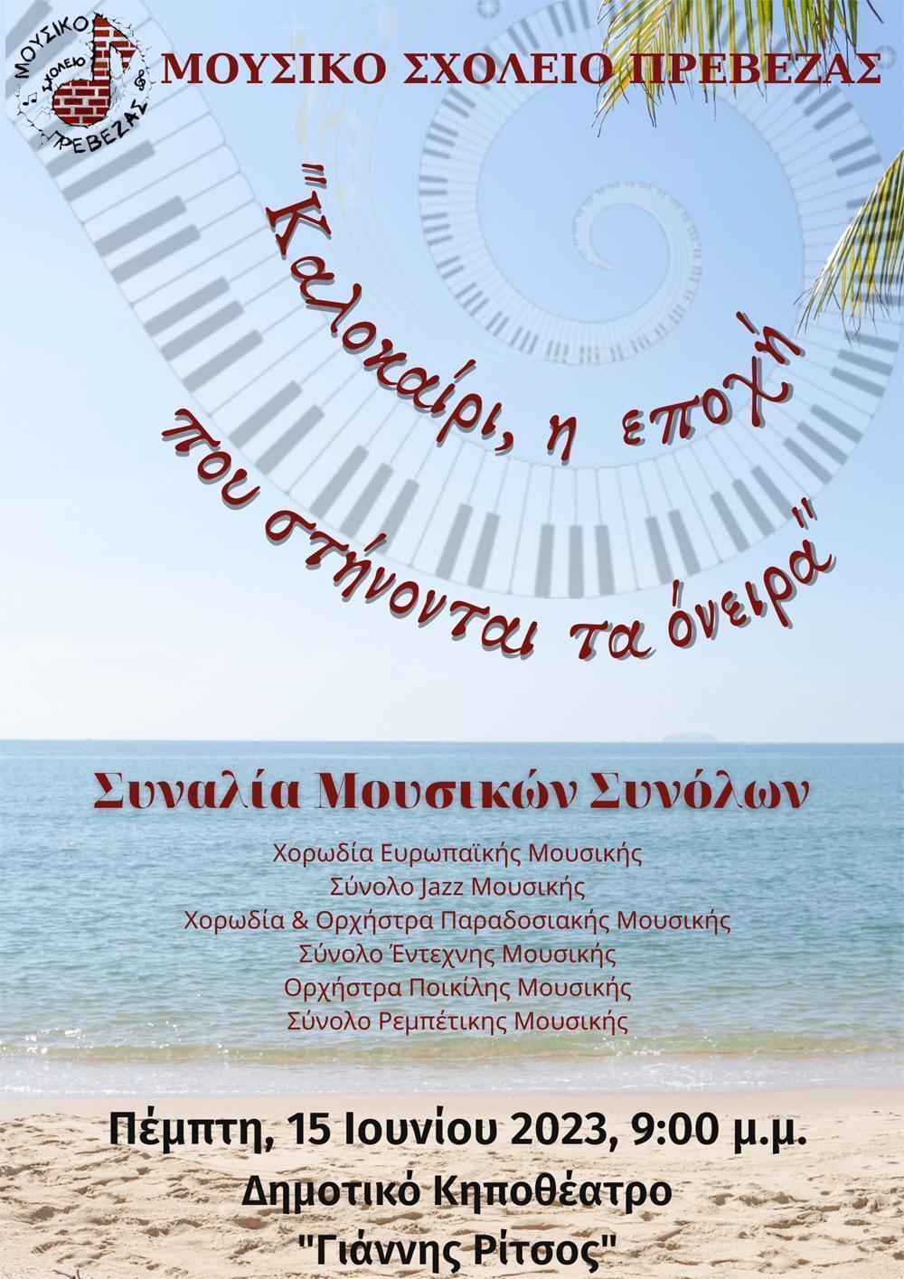 Το Μουσικό Σχολείο Πρέβεζας θα πραγματοποιήσει την Καλοκαιρινή του Συναυλία με τίτλο «Καλοκαίρι, η εποχή που στήνονται τα όνειρα» την Πέμπτη 15 Ιουνίου 2023 στο Δημοτικό Κηποθέατρο Πρέβεζας «Γιάννης Ρίτσος», στις 9.00μ.μ.