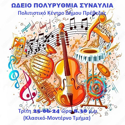 Συναυλία του Κλασικού και Μοντέρνου Τμήματος της Ορχήστρας και της Χορωδίας θα πραγματοποιθεί από το Ωδείο Πολυρυθμία την Τρίτη 25 Ιουνίου 2024 στο Πολιτιστικό Κέντρο του Δήμου Πρέβεζας.