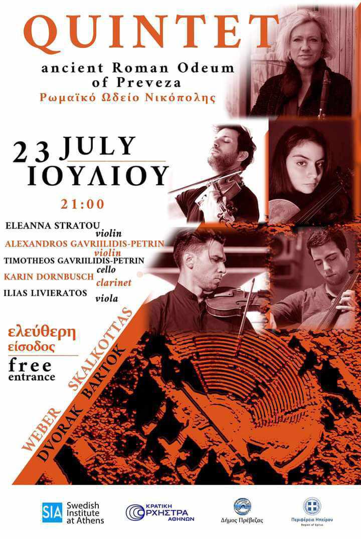 Η συναυλία θα έχει έντονη ηπειρωτική αναφορά, με τη συμπερίληψη του ηπειρωτικού χορού του Νίκου Σκαλκώτα και του κλαρίνου, του αγαπημένου οργάνου της Ηπείρου στο κουιντέτο του Weber καθώς και τη συμμετοχή δυο σπουδαίων νέων Πρεβεζάνων μουσικών. Επιπλέον, η εκδήλωση συνδυάζει διάφορα ενδιαφέροντα στοιχεία, περιλαμβάνοντας διεθνή συνεργασία με το αρχαιολογικό ινστιτούτο Σουηδίας στην Αθήνα και την υποστήριξη της Κρατικής ορχήστρας Αθηνών. Οι μουσικοί Ελεάννα Στράτου, Αλέξανδρος Γαβριηλίδης-Πέτριν, Ηλίας Λιβιεράτος, και Τιμόθεος Γαβριηλίδης Πέτριν, σε συνδυασμό με την Karin Dornbusch από τη Σουηδία, θα προσφέρουν μια ευκαιρία για τους λάτρεις της κλασικής μουσικής να απολαύσουν έναν μαγευτικό συνδυασμό ήχων και εκφράσεων στο μαγευτικό περιβάλλον του Αρχαίου Ωδείου Νικόπολης Πρέβεζας.