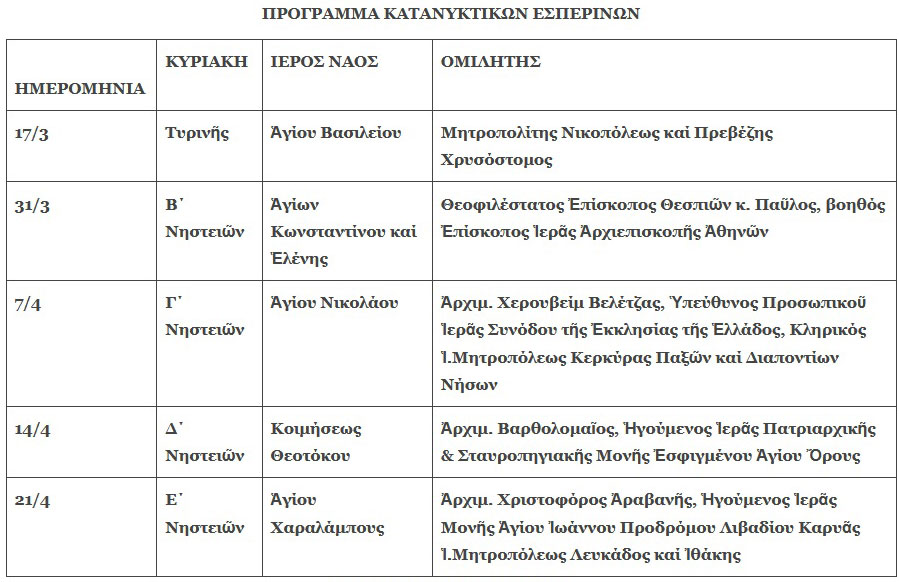 Ὁ Σεβασμιώτατος Μητροπολίτης μας κ. Χρυσόστομος θά χοροστατήσει κατά τίς ἀκολουθίες τῶν Κατανυκτικῶν Ἑσπερινῶν, τῶν Χαιρετισμῶν τῆς Ὑπεραγίας Θεοτόκου καί τοῦ Ἀκαθίστου Ὕμνου, σύμφωνα μέ τό ἀκόλουθο πρόγραμμα: