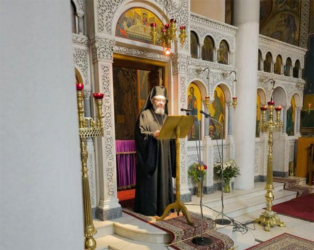 Τήν διακονία τοῦ λόγου ἀνέλαβε, προσκεκλημένος τοῦ Σεβασμιωτάτου Μητροπολίτου μας κ. Χρυσοστόμου, ὁ Πανοσιολ. Ἀρχιμ. π. Σεραπίων Μιχαλάκης, Α΄ Γραμματεύς τῆς Ἱερᾶς Συνόδου τῆς Ἐκκλησίας τῆς Ἑλλάδος καί Προϊστάμενος τοῦ Μητροπολιτικοῦ Ἱεροῦ Ναοῦ Κοιμήσεως Θεοτόκου Μεγάρων, ὁ ὁποῖος ἀνέπτυξε τό ἐπίκαιρο θέμα «Τό πνευματικό στάδιο τῆς νηστείας τῶν χριστιανῶν κατά τήν περίοδο τῆς Μεγάλης Τεσσαρακοστῆς καί ἡ ἐνίσχυσή τους ἀπό τήν προσκύνηση τοῦ Τιμίου καί Ζωοποιοῦ Σταυροῦ». Ὁ Πανοσιολογιώτατος ὁμιλητής συνέδεσε τή νηστεία τῆς Ἁγίας καί Μεγάλης Τεσσαρακοστῆς μέ τήν δύναμη πού λαμβάνει ὁ ἀγωνιζόμενος διά τῆς νηστείας πιστός ἀπό τή Χάρη τοῦ Τιμίου καί Ζωοποιοῦ Σταυροῦ, ἀντλώντας τά θεολογικά του ἐπιχειρήματα ἀπό τόν θεολογικό θησαυρό τοῦ Οὐρανοφάντορος Μεγάλου Βασιλείου.