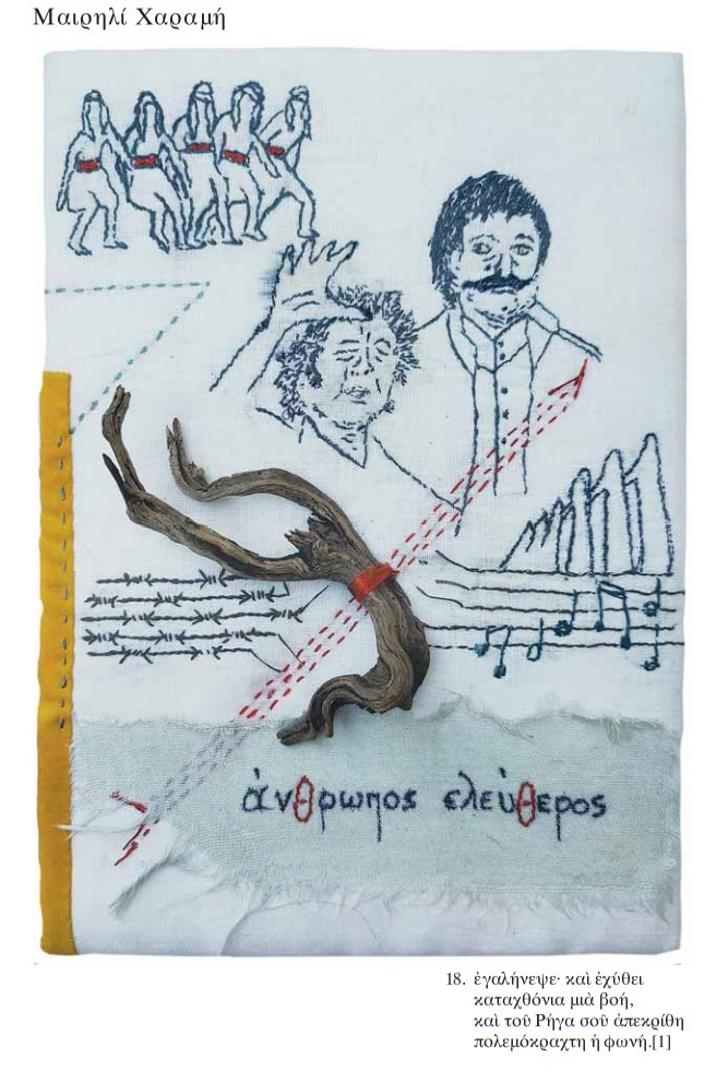 Τα πρωτότυπα έργα αυτής της ανάγνωσης έχουν υλοποιηθεί με διαφορετικές τεχνικές και υλικά, (ζωγραφική, γλυπτική, φωτογραφία, κολλάζ, ύφασμα, κέντημα, πέτρα, χαρτί, κεραμική ύλη κ.ά.), όλα όμως διατηρούν την ίδια διάσταση, προκειμένου ο θεατής να μπορεί να τα περιτρέξει με τον τρόπο των ανοιχτών σελίδων ενός βιβλίου. Με μικρό σε δέμας αλλά μέγιστο σε συμβολισμό αποτέλεσμα. Ένα λυτρωτικό πολυφωνικό τραγούδι συλλογισμού, έμπνευσης, δημιουργίας και, εντέλει, Ελευθερίας.