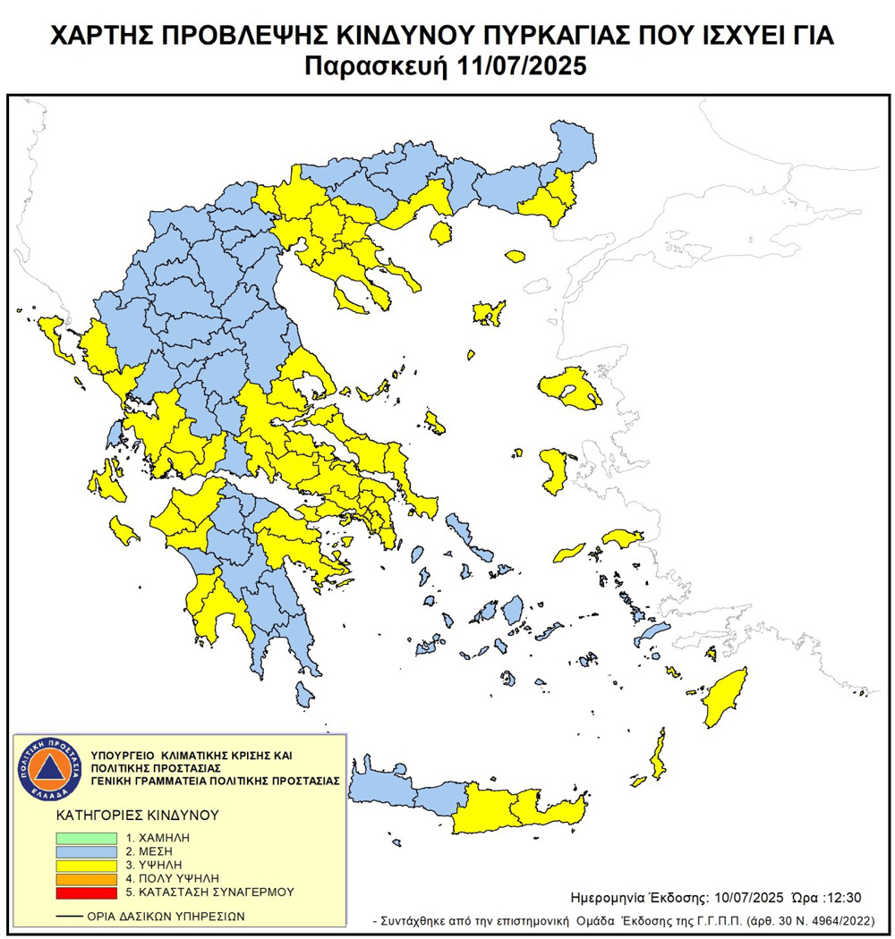 Σύμφωνα με τον από 10-7-2025 Ημερήσιο Χάρτη Πρόβλεψης Κινδύνου Πυρκαγιάς της Γενικής Γραμματείας Πολιτικής Προστασίας αύριο 11 Ιουλίου 2025 ημέρα Παρασκευή ο κίνδυνος εκδήλωσης πυρκαγιάς είναι υψηλός (κατηγορία κινδύνου 3) για την Περιφερειακή Ενότητα Πρέβεζας. Έχοντας υπόψη την ανωτέρω πρόβλεψη, υπενθυμίζεται ότι τίθεται σε ισχύ η υπ΄αριθμ.πρωτ. ΠΗ/ΑΔΠΠ/ 108989/6129/20-6-2025 (ΑΔΑ:97ΞΧ7Λ9-ΑΔΖ) Απόφαση του Αντιπεριφερειάρχη Π.Ε. Πρέβεζας κ.Στράτου Ιωάννου, για την προληπτική απαγόρευση κυκλοφορίας από τη δύση του ηλίου έως 6ης πρωινής της επομένης ημέρας στις παρακάτω περιοχές: