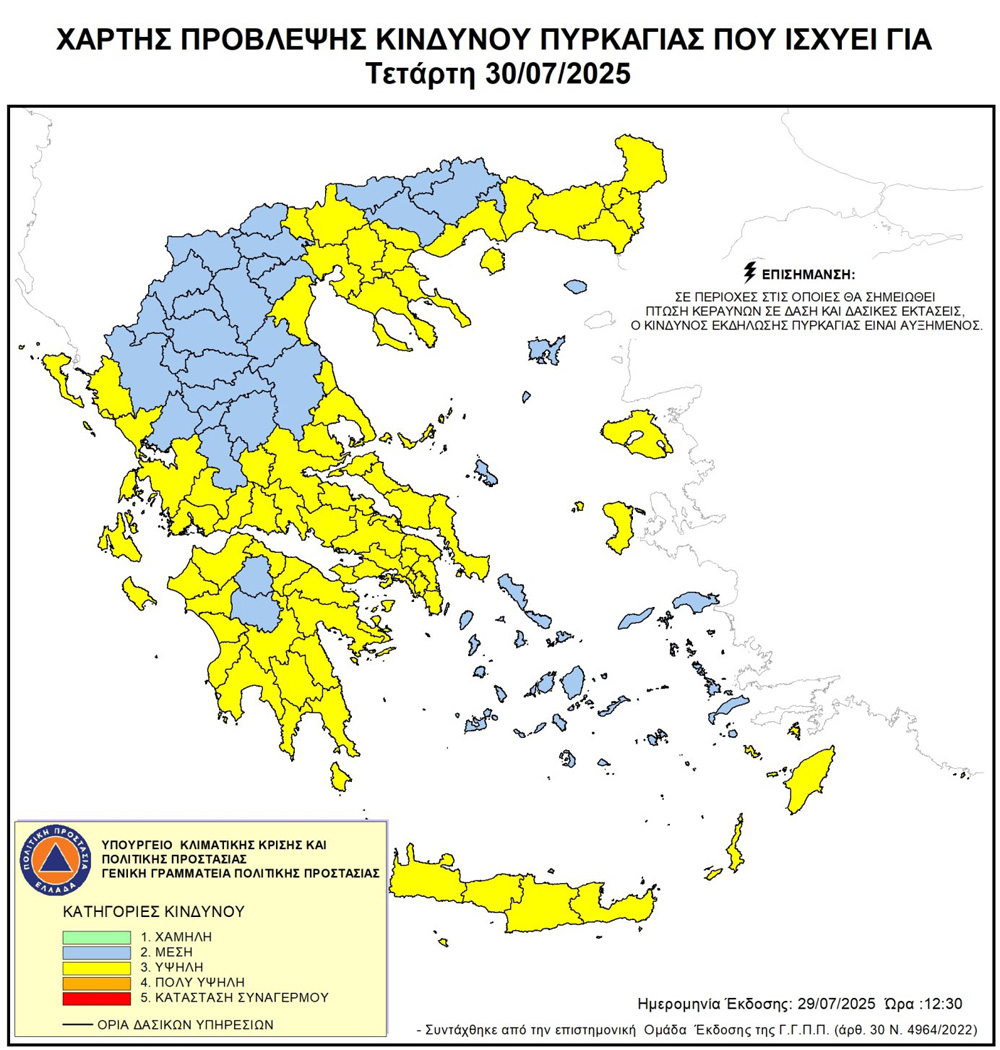 Σύμφωνα με τον από 29-7-2025 Ημερήσιο Χάρτη Πρόβλεψης Κινδύνου Πυρκαγιάς της Γενικής Γραμματείας Πολιτικής Προστασίας αύριο 30 Ιουλίου 2025 ημέρα Τετάρτη ο κίνδυνος εκδήλωσης πυρκαγιάς είναι υψηλός (κατηγορία κινδύνου 3) για την Περιφερειακή Ενότητα Πρέβεζας. Έχοντας υπόψη την ανωτέρω πρόβλεψη, υπενθυμίζεται ότι τίθεται σε ισχύ η υπ΄αριθμ.πρωτ. ΠΗ/ΑΔΠΠ/ 108989/6129/20-6-2025 (ΑΔΑ:97ΞΧ7Λ9-ΑΔΖ) Απόφαση του Αντιπεριφερειάρχη Π.Ε. Πρέβεζας κ.Στράτου Ιωάννου, για την προληπτική απαγόρευση κυκλοφορίας από τη δύση του ηλίου έως 6ης πρωινής της επομένης ημέρας στις παρακάτω περιοχές: