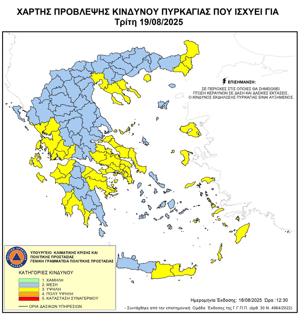 Στις περιοχές υψηλού κινδύνου πυρκαγιάς (κατηγορία 3) βρίσκεται ο Νομός Πρέβεζας την Τρίτη 19 Αυγούστου, σύμφωνα με τον χάρτη πρόβλεψης κινδύνου του Υπουργείου Κλιματικής Κρίσης και Πολιτικής Προστασίας.