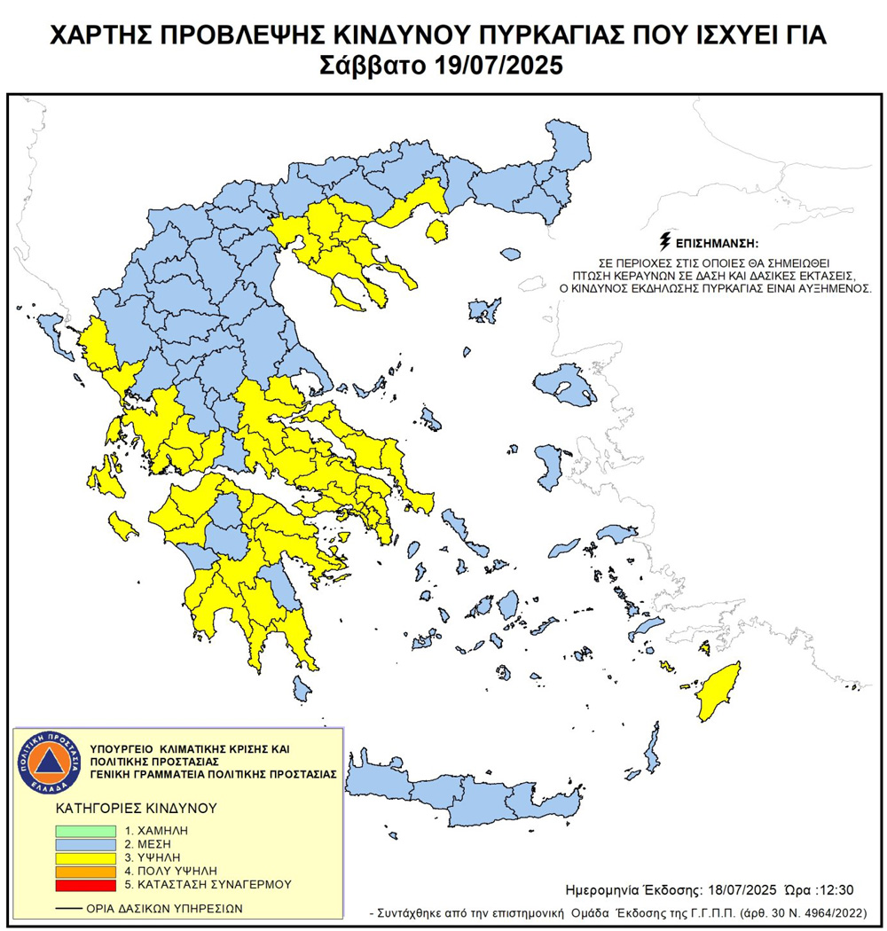 Παραμένει το Σάββατο 19 Ιουλίου στις περιοχές υψηλού κινδύνου πυρκαγιάς ο Νομός Πρέβεζας, σύμφωνα με τον χάρτη πρόβλεψης κινδύνου του Υπουργείου Κλιματικής Κρίσης και Πολιτικής Προστασίας, με τις αρμόδιες Αρχές να βρίσκονται σε επιφυλακή.