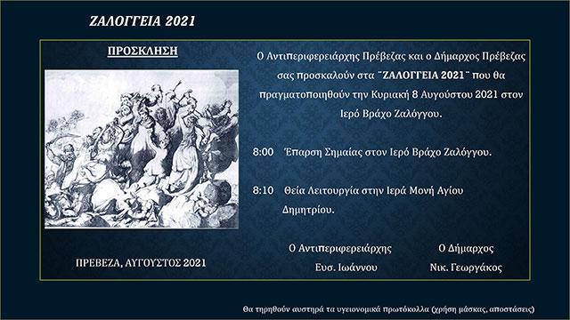 Με περιορισμένο αριθμό προσκεκλημένων λόγω των ιδιαίτερων υγειονομικών συνθηκών που επιβάλλει η πανδημία του κορονοϊού, θα πραγματοποιηθούν την Κυριακή 8 Αυγούστου τα “Ζαλόγγεια 2021”.