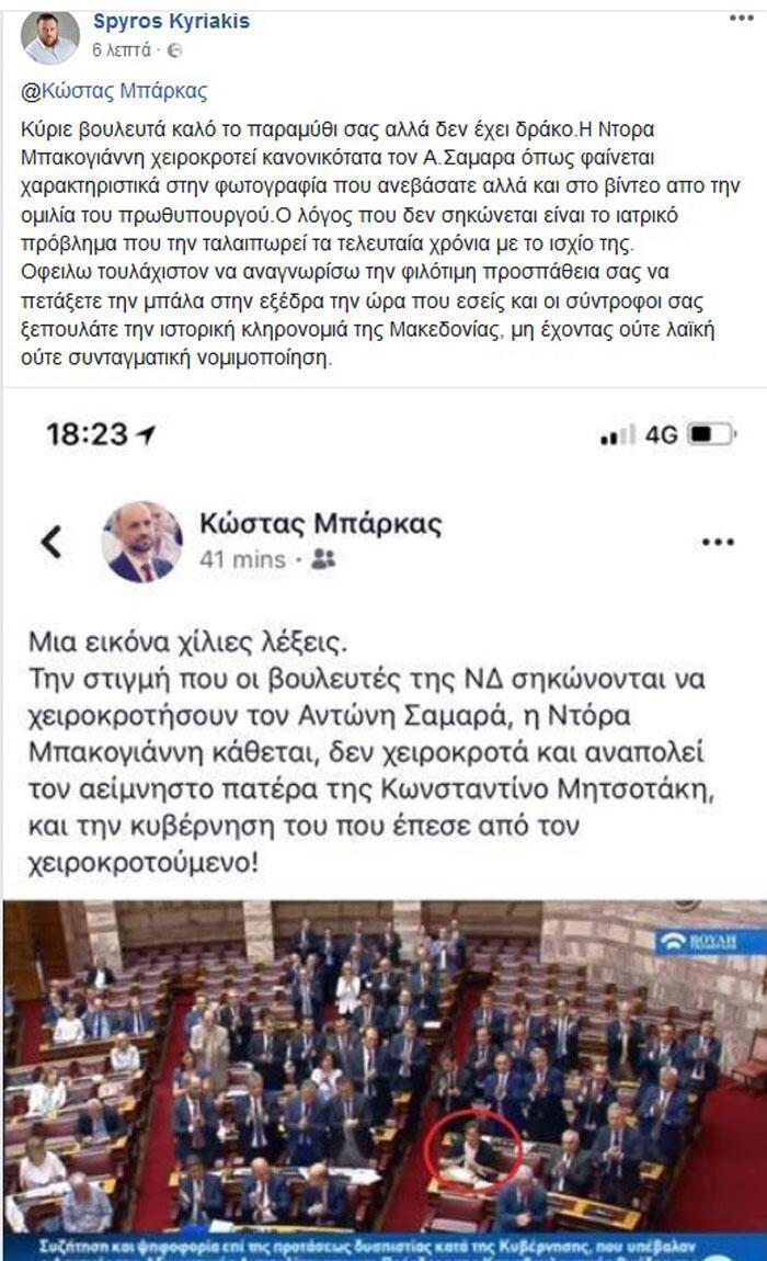 Ο κ. Μπάρκας σχολιάζοντας σχετική φωτό από το Κοινοβούλιο, υποστηρίζει πως η Ντ. Μπακογιάννη δεν χειροκροτεί τον Α. Σαμαρά... αφήνοντας έτσι αιχμές για τη στάση της.