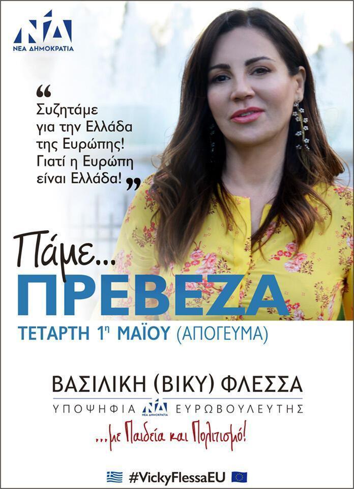 Στην Πρέβεζα θα βρίσκεται σήμερα (1η Μαΐου)η υποψήφια Ευρωβουλευτής της Νέας Δημοκρατίας Βίκυ Φλέσσα, η οποία στις 8 το απόγευμα θα παραχωρήσει συνέντευξη τύπου στην αίθουσα του ξενοδοχείου Dioni.