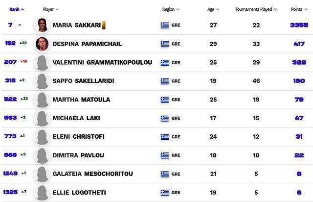 Πάντα κορυφαία Ελληνίδα φυσικά είναι η Μαρία Σάκκαρη, η οποία παρέμεινε αυτή την εβδομάδα στο Νο.7 της παγκόσμιας κατάταξης.