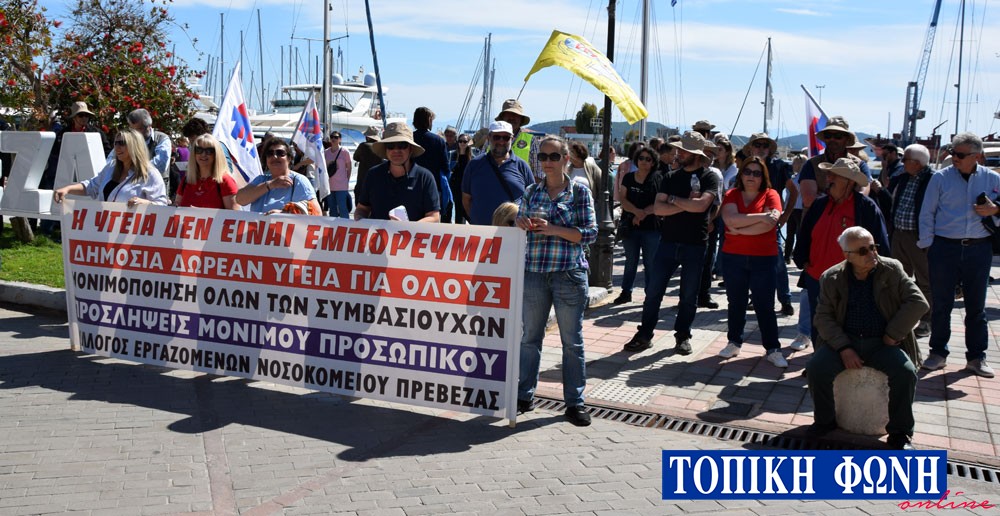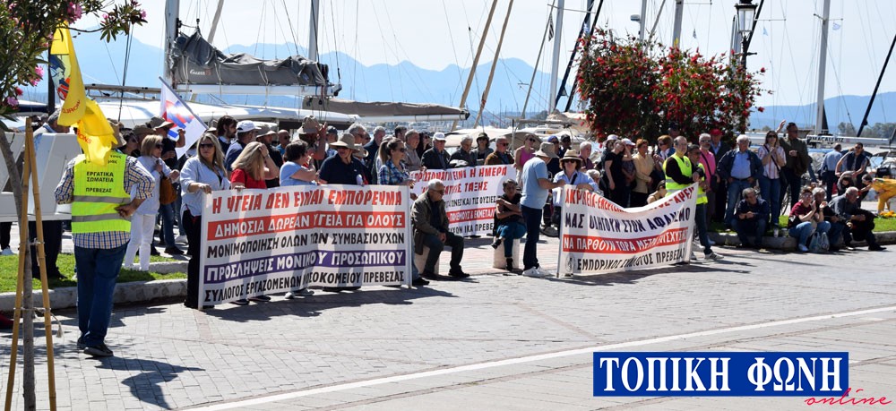 Δυναμική ήταν η συγκέντρωση που πραγματοποιήθηκε από συνδικαλιστικές οργανώσεις και σωματεία δημοσίου και ιδιωτικού τομέα, συνταξιούχους, εκπρόσωπους του εμπορικού Συλλόγου, του Συλλόγου Εργαζομένων Νοσοκομείου κ.ά. στην παραλία μπροστά από το Δικαστικό Μέγαρο Πρέβεζας.
