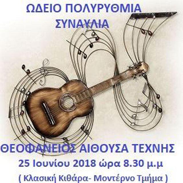 Τη Δευτέρα 25 Ιουνίου στις 8.30 το βράδυ θα πραγματοποιηθεί η συναυλία του τμήματος κλασικής κιθάρας και μοντέρνου τμήματος στη Θεοφάνειο Αίθουσα Τέχνης