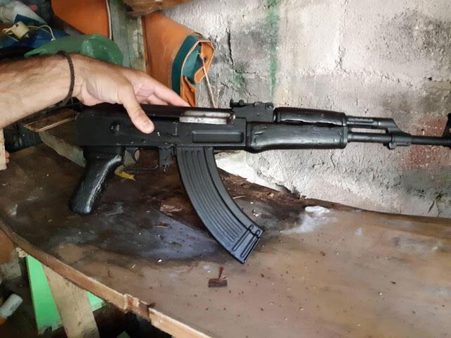 στην αποθήκη του σπιτιού (σε τσιμεντένια κρύπτη): ένα πολεμικό τυφέκιο (kalashnikov), με το γεμιστήρα του καθώς και ένα περίστροφο.