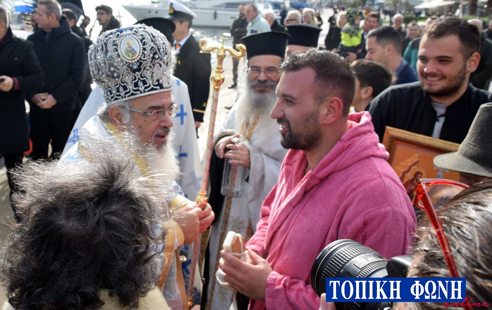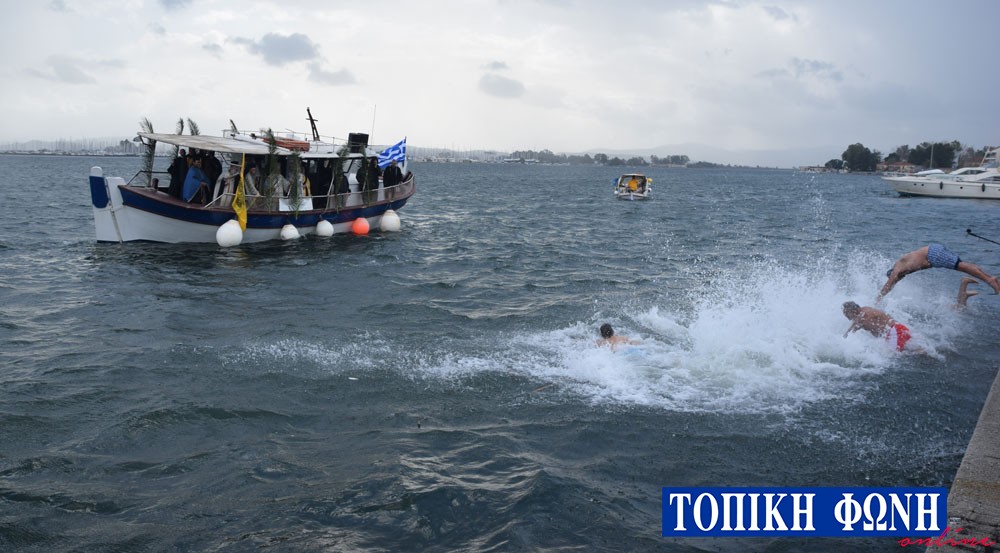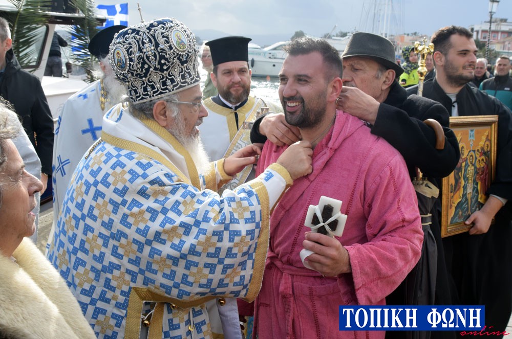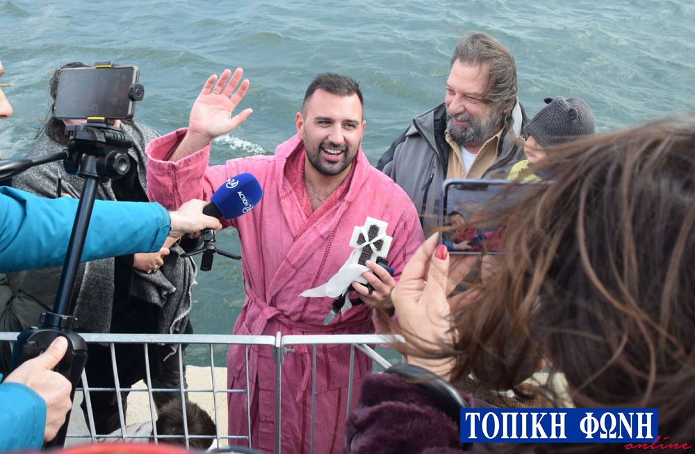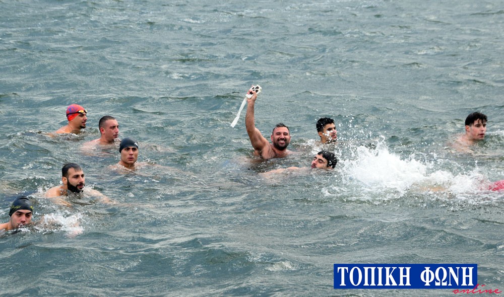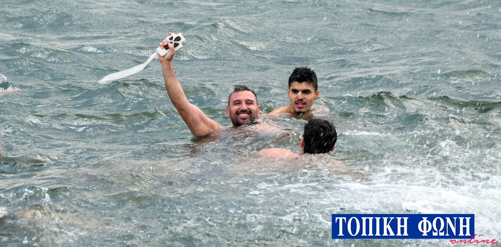 Περίπου 15 κολυμβητές αψήφησαν τις καιρικές συνθήκες και βούτηξαν στη θάλασσα, ενώ μετά από αρκετά λεπτά καθυστέρησης καθώς τα νερά ήταν θολά λόγω των βροχοπτώσεων, ο τυχερός που βρήκε τον Σταυρό ήταν για 8η φορά ο Κίμωνας Πουρναρόπουλος, ο οποίος ευχήθηκε χρόνια πολλά και καλή χρονιά.