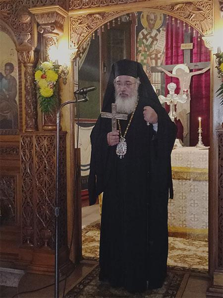 Πρό τῆς ἀπολύσεως τῆς Θείας Λειτουργίας ὁ Σεβασμιώτατος Μητροπολίτης μας, ἀπευθυνόμενος στό ἐκκλησίασμα εὐχαρίστησε γιά τήν παρουσία τους ὡς ἔνδειξη τιμῆς τόσο πρός τόν ἑορταζόμενο Ἅγιο ὅσο καί πρός τό πρόσωπό του καί ὑπενθύμισε σέ ὅλους ὅτι ἡ στάση μας ἀπέναντι στό Θεό πρέπει νά εἶναι εὐχαριστιακή καί δοξολογική εἴτε γιά τίς δυσκολίες εἴτε γιά τίς εὐεργεσίες Του, χρησιμοποιώντας τά λόγια τοῦ ἱεροῦ Χρυσοστόμου ὅταν ἦταν ἐξόριστος «Δόξα τῷ Θεῷ πάντων ἕνεκεν».
