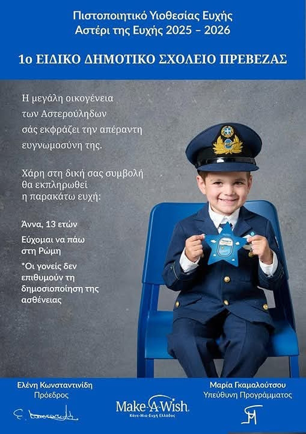 Το Ειδικό Δημοτικό Σχολείο Πρέβεζας κάνοντας πράξη την έννοια της προσφοράς, της ελπίδας και της ενσυναίσθησης συμμετείχε στο πρόγραμμα «Αστέρι της Ευχής» 2025-2026 του Make A Wish ενισχύοντας την ευχή της Άννας μιας 13χρονης κοπέλας με σπάνια ασθένεια να επισκεφθεί τη Ρώμη.