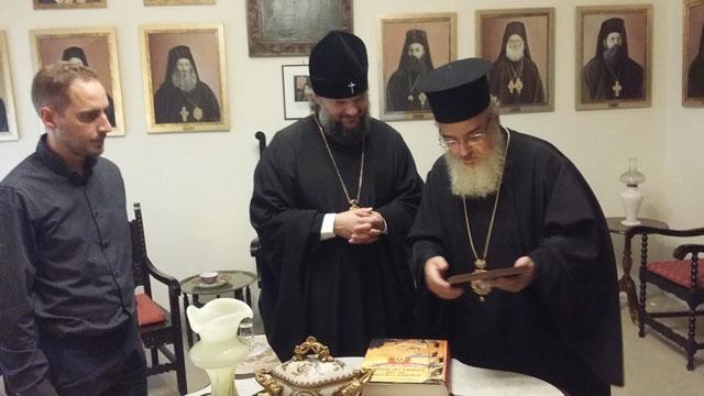 Στα πλαίσια προσκυνηματικής εκδρομής που πραγματοποίησε από 16 μέχρι 20 Σεπτεμβρίου στην Ήπειρο ο Σεβασμιώτατος Αρχιεπίσκοπος Βερέγιας (Πατριαρχείου Μόσχας) κ. Αμβρόσιος Πρύτανης της Ιερατικής Σχολής Υπαπαντής, μετά της συνοδείας του, το απόγευμα της 19ης Σεπτεμβρίου επισκέφθηκε τον Σεβ. Μητροπολίτη μας κ. Χρυσόστομο.