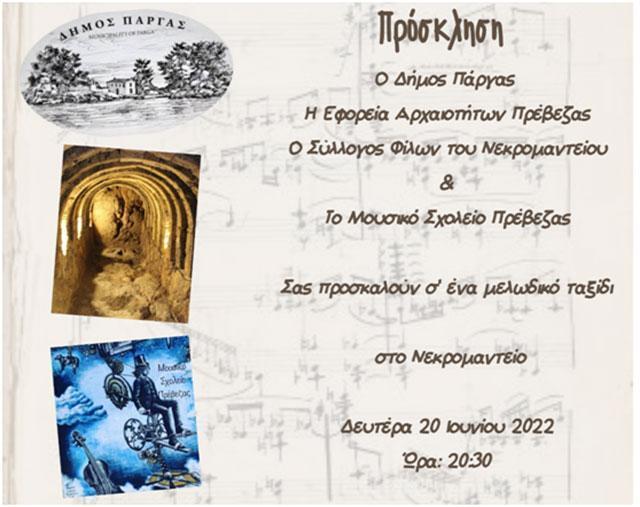 Το Μουσικό Σχολείο Πρέβεζας γιορτάζει την παγκόσμια ημέρα της μουσικής στον εμβληματικό χώρο του Νεκρομαντείου, τη Δευτέρα, 20 Ιουνίου 2022. Ευχαριστούμε θερμά το Δήμο Πάργας, την Εφορεία Αρχαιοτήτων Πρέβεζας και τον Σύλλογο Φίλων του Νεκρομαντείου που μας προσφέρουν απλόχερα τη φιλοξενία τους σε μια ξεχωριστή για εμάς συναυλία! Σας περιμένουμε!